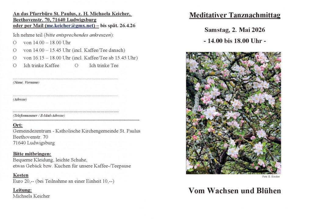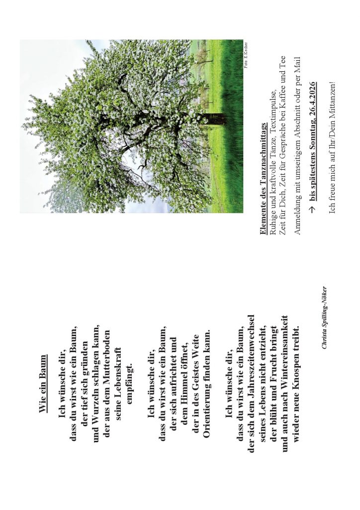 Meditativer Tanznachmittag am 2. Mai Erstellt am 13. April 202613. April 2026 von Wolfram Hartmann Teile diesen Beitrag über folgende Plattformen:E-Mail drucken teilen teilen teilen merken RSS-feed teilen